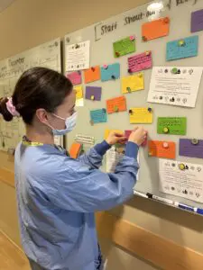 Even something as simple as a series of bulletin boards has had a big impact on the Interventional Radiology (IR) team, which used its grant to enhance team connection and collaboration. The team created a calendar with staff events, birthdays, holidays and meetings, a “Pets of IR Board” with a star pet of the month and a recognition board for staff shout-outs from both patients and other staff members.